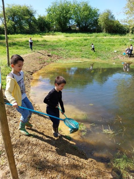 12/04 : la 2e intervention Vendée eau sur le thème de la mare a eu lieu le vendredi 12 avril après-midi. Cette fois, nous avons chaussé nos bottes pour nous rendre autour d’une mare située au plan d’eau. Nous avons d’abord écouté les oiseaux présents, nous en avons entendu 6 différents : l’hirondelle, la fauvette, la mésange, le pinçon, le grimpereau et le rouge queue. Ensuite, les enfants ont observé l’eau de la mare pour savoir si elle est en bonne santé. Enfin est venue l’heure de la « pêche au filet » afin de récolter des espèces vivantes que nous avons ensuite observées en classe.