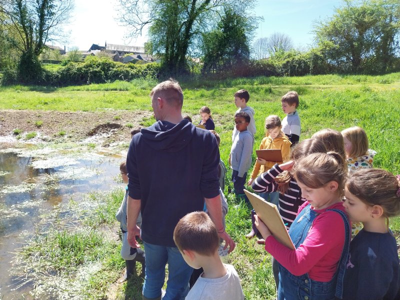 12/04 : la 2e intervention Vendée eau sur le thème de la mare a eu lieu le vendredi 12 avril après-midi. Cette fois, nous avons chaussé nos bottes pour nous rendre autour d’une mare située au plan d’eau. Nous avons d’abord écouté les oiseaux présents, nous en avons entendu 6 différents : l’hirondelle, la fauvette, la mésange, le pinçon, le grimpereau et le rouge queue. Ensuite, les enfants ont observé l’eau de la mare pour savoir si elle est en bonne santé. Enfin est venue l’heure de la « pêche au filet » afin de récolter des espèces vivantes que nous avons ensuite observées en classe.